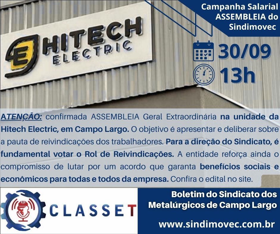 ATENÇÃO: confirmada ASSEMBLEIA na Hitech Electric dia 30/09