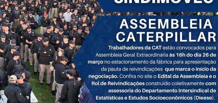 Trabalhadores da CAT estão convocados para Assembleia Geral Extraordinária às 16h do dia 26 de março no estacionamento da fábrica para apresentação da pauta de reivindicações construída coletivamente e que...