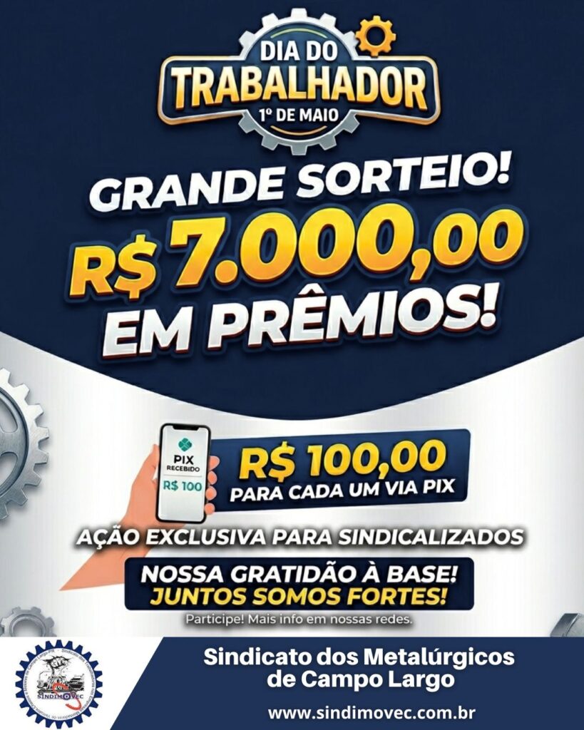Para reforçar o compromisso com a força de trabalho, a direção do Sindicato vai realizar um sorteio (30) de R$ 7 mil que serão distribuídos entre 70 trabalhadores sindicalizados da Caterpillar (CAT) e Metalsa. Cada um receberá um PIX de R$ 100 como forma de celebrar a data com benefício imediato na conta de quem faz a diferença no chão de fábrica.