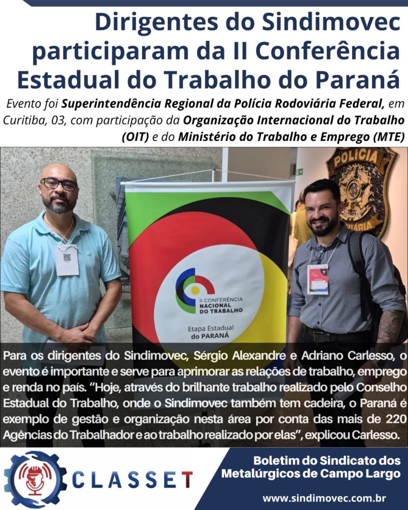 Para os dirigentes do Sindimovec, Adriano Carlesso e Sérgio Alexandre, o evento é importante e serve para aprimorar as relações de trabalho, emprego e renda no país. “Hoje através do brilhante trabalho realizado pelo Conselho Estadual do Trabalho, onde o Sindimovec também tem cadeira, o Paraná é exemplo de gestão e organização nesta área. Isso por conta das mais de 220 Agências do Trabalhador e do trabalho realizado por elas”, explicou Carlesso.
