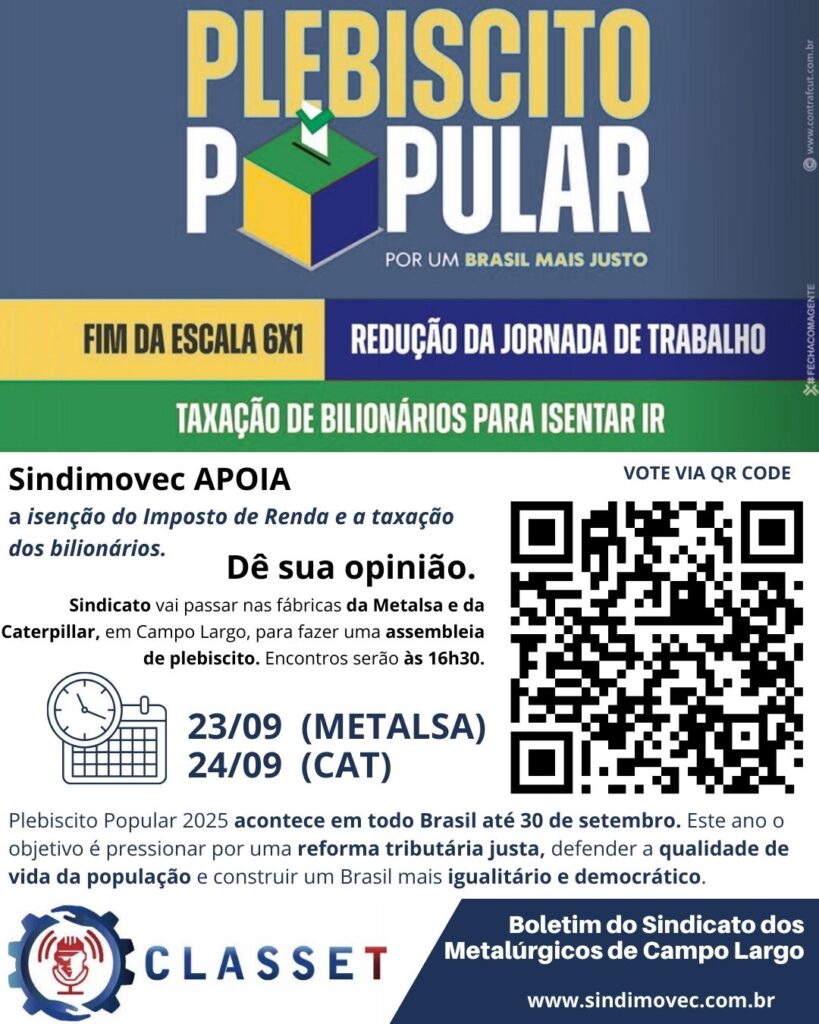 Dê sua opinião. O Sindimovec vai passar nas fábricas da Metalsa (terça-feira – 23/09) e da Caterpillar (quarta-feira -24/09)), em Campo Largo, às 16h30, para fazer uma assembleia de plebiscito. O objetivo do encontro é conversar com a força de trabalho sobre isenção do Imposto de Renda para quem ganha até 5 mil reais, a taxação dos bilionários, fim da escala 6×1 e redução da jornada de trabalho sem redução de salário.