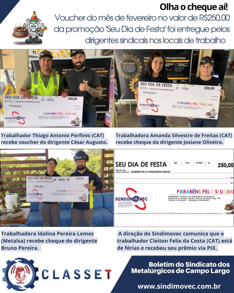 Se você é associado ao Sindimovec, fique ligado. Todo mês tem sorteio do ‘Seu Dia de Festa’. Promoção que presenteia a família metalúrgica com dois vouchers exclusivos para trabalhadoras e dois para trabalhadores.