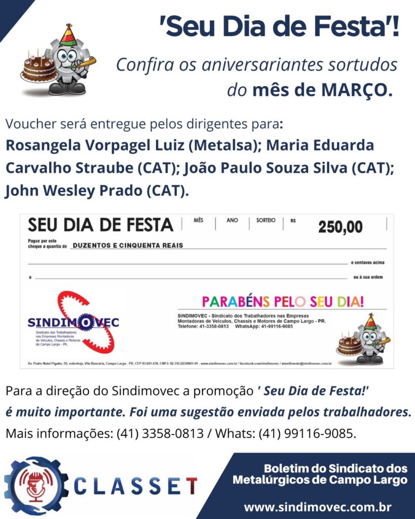 Se você é associado ao Sindimovec, fique ligado. Todo mês tem sorteio do ‘Seu Dia de Festa’. Promoção presenteia família metalúrgica com dois vouchers exclusivos para trabalhadoras e dois para trabalhadores.