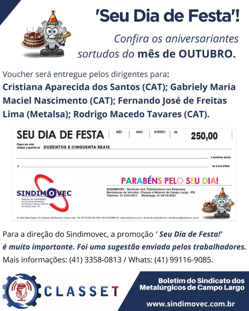 Se você é associado ao Sindimovec, fique ligado. Todo mês tem sorteio do ‘Seu Dia de Festa’. Promoção que presenteia a família metalúrgica com dois vouchers exclusivos para trabalhadoras e dois para trabalhadores.