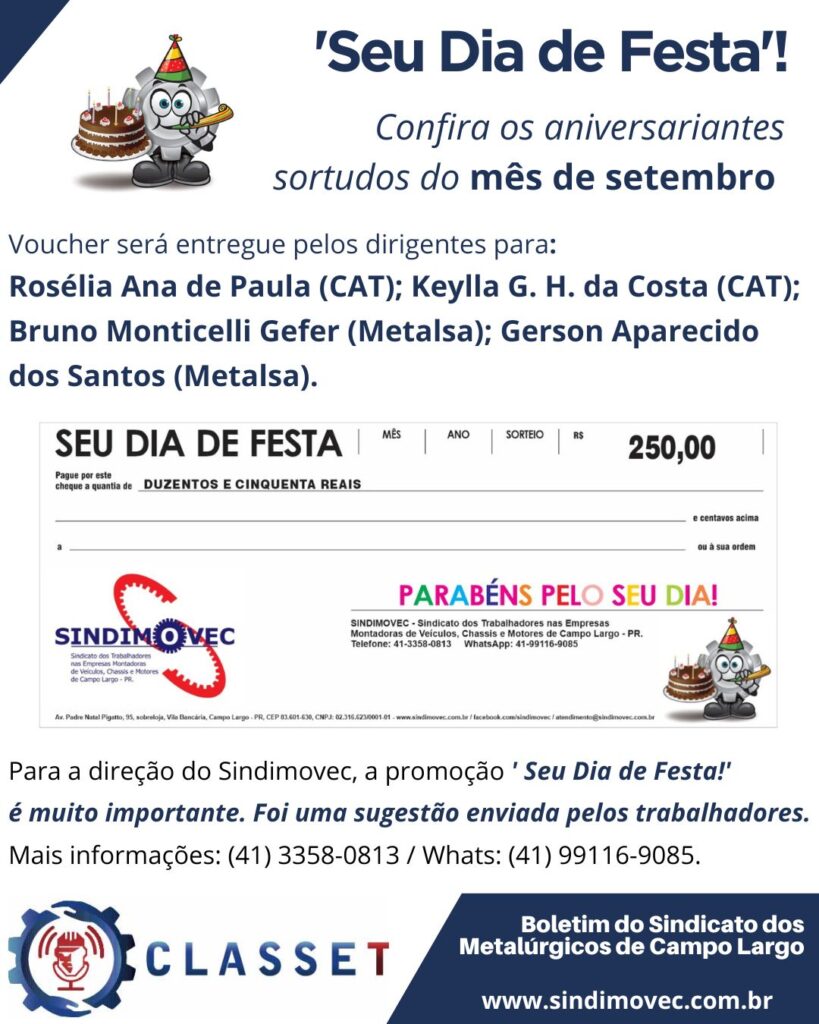 Se você é associado ao Sindimovec, fique ligado. Todo mês tem sorteio do ‘Seu Dia de Festa’. Promoção que presenteia a família metalúrgica com dois vouchers exclusivos para trabalhadoras e dois para trabalhadores.