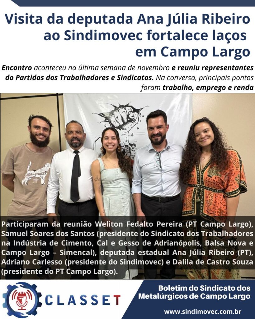 Recente visita da deputada estadual Ana Júlia Ribeiro (PT) ao Sindimovec (Sindicato dos Metalúrgicos de Campo Largo) reforça compromisso entre o poder legislativo do estado e a representação dos trabalhadores no município. Na oportunidade, Ana Júlia colocou seu gabinete à disposição dos trabalhadores. “Tratamos de trabalho, emprego e renda, também sobre questões envolvendo a antiga unidade da Stellantis, uma excelente estrutura fabril que está desativada e pode receber grandes empresas para gerar de empregos na cidade”, explicou o presidente do Sindimovec, Adriano Carlesso.